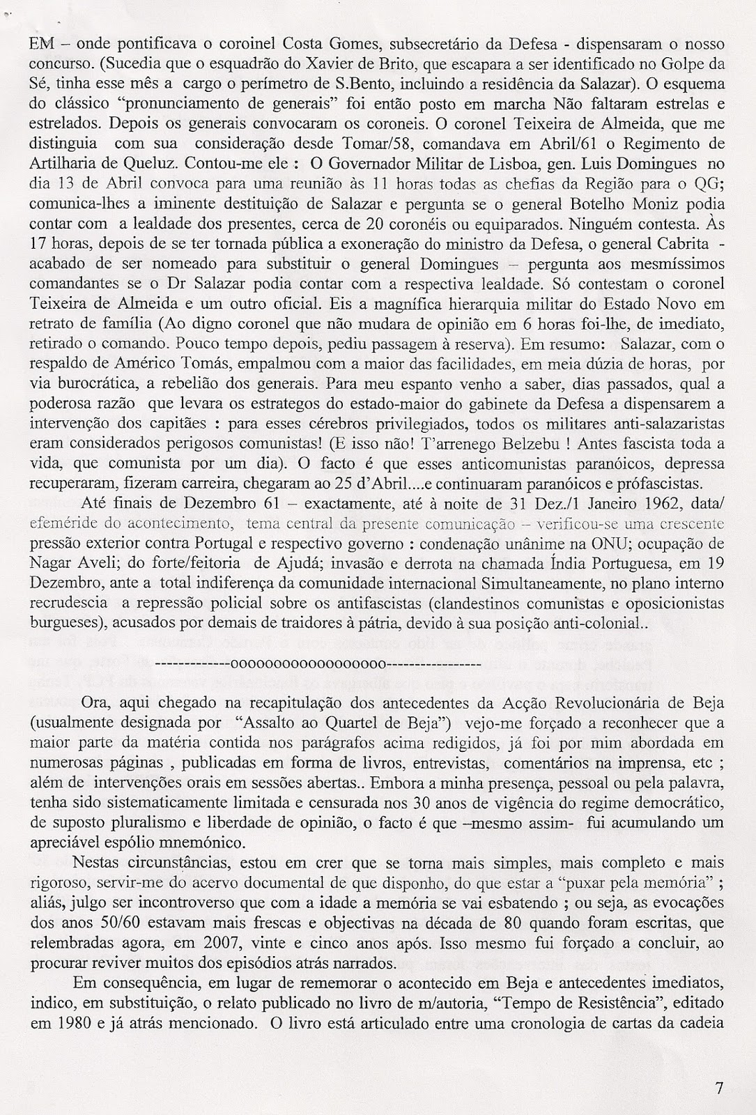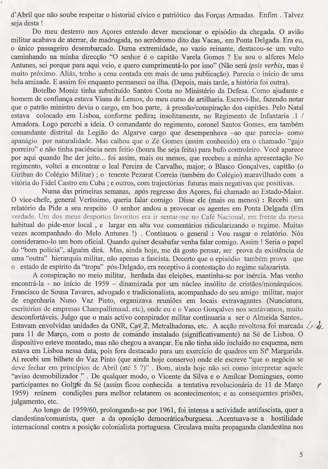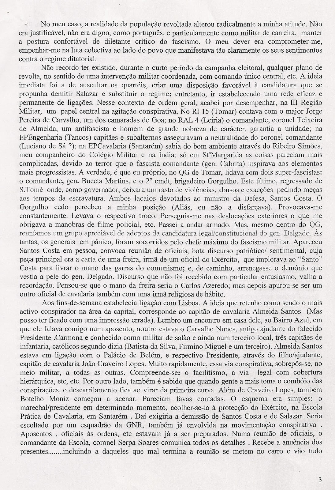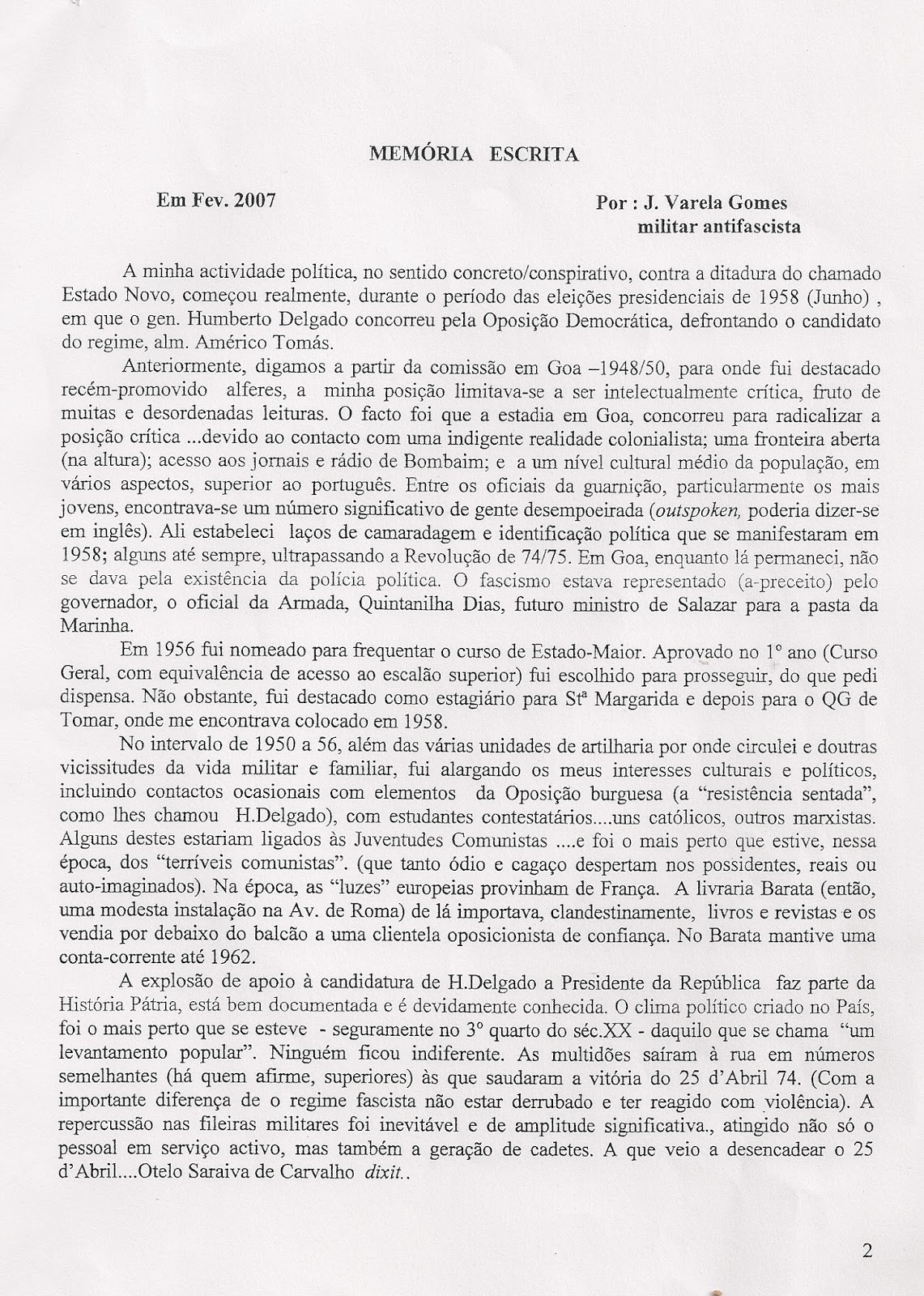 Deixo-vos o texto da comunicação de João Varela Gomes às Conferências da Cooperativa Militar. O autor acabou por falar de improviso com recurso a uns apontamentos que também estão em meu poder. Mas o conteúdo destas páginas, que JVG entregou previamente à organização, é de tal forma valioso que me parece importante chegar ao conhecimento do maior número de pessoas possível. Por elas se pode acompanhar o percurso combativo de um Homem e de um Militar que entre 1958-1974 escolheu estar contra Salazar e Caetano e ao lado das gentes do seu país.