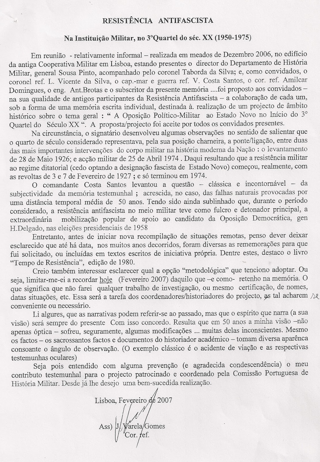 2 - Conheci Varela Gomes muito antes de o conhecer. Sabia de há muito os feitos, a coragem e o carácter forte e impoluto desse homem que era uma «força da natureza», no dizer do próprio filho, Paulo Varela Gomes, mas o nosso encontro pessoal deu-se apenas em Março de 2007 aquando de uma série de conferências levadas a cabo pela Cooperativa Militar com o apoio da Comissão Portuguesa de História Militar, subordinadas ao tema: Oposição Político-Militar ao Estado Novo, no 3º Quartel do Séc. XX, efectuadas nos dias 20, 22, 27 e 29 de Março de 2007. Varela Gomes interveio no dia 27 e a sua comunicação deixou-me entusiasmada pelo que dava a conhecer do percurso antifascista mas também pela forma contundente como se referiu a duas comunicações anteriores, altamente reacionárias, de dois oficiais reformados da Força Aérea. Intervindo a seguir a eles, Pezarat Correia desmontara já esses discursos mas Varela Gomes não quis também deixar de responder aos dois saudosos do salazarismo.