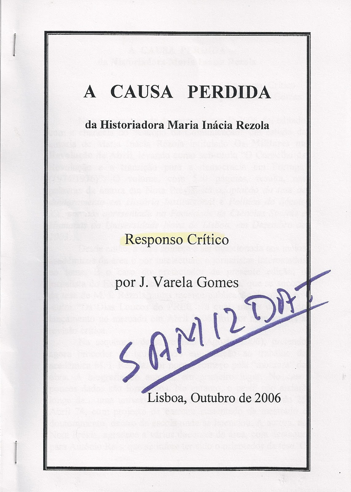 Perguntei-lhe porque não continuou o projecto das suas memórias iniciado com Tempo de Resistência, I Parte, (Jan 1962-Set 1963), da Ler Editora, 1980. Resposta: «porque ninguém lê, ninguém se interessa». É pena, digo eu. Todos ficámos a perder.